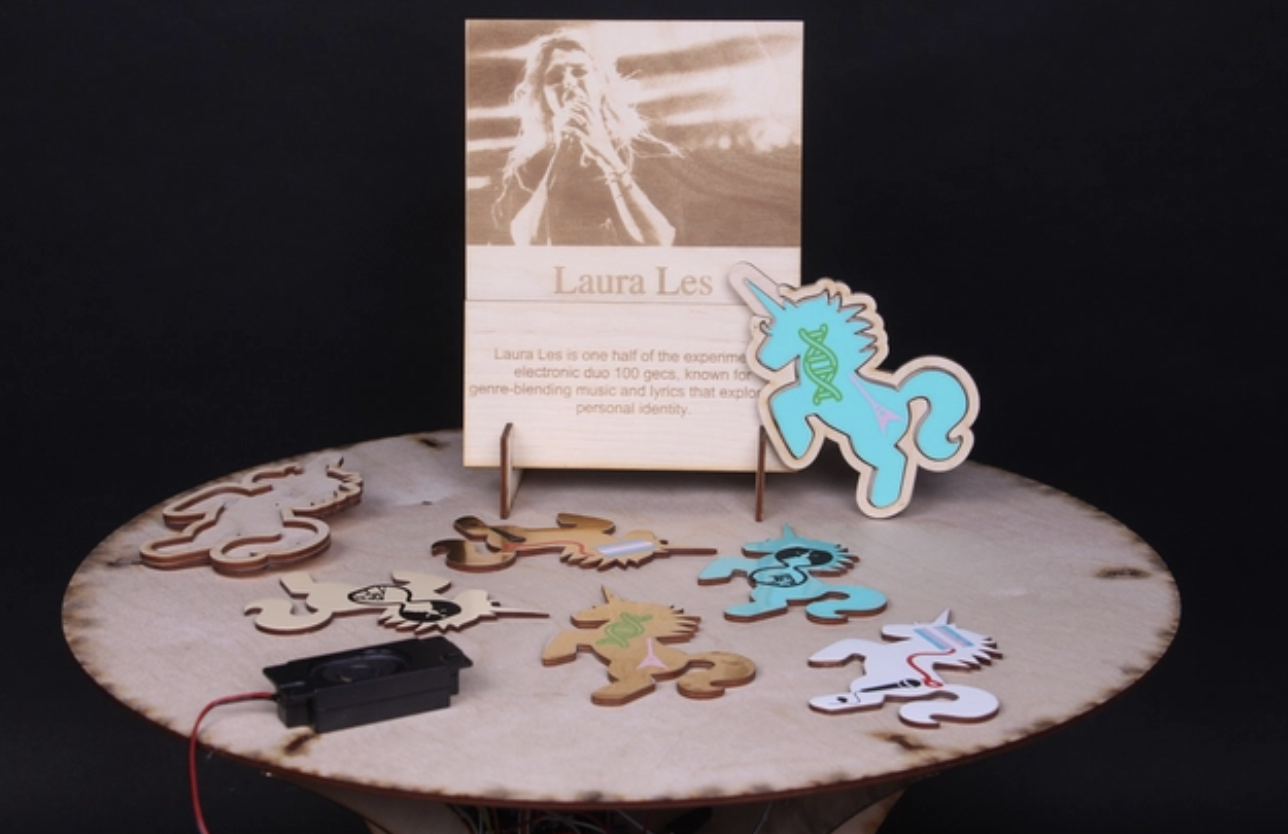 A multi-sensory exhibit created for the Queer Youth Exhibition co hosted by The Design Museum Everywhere. The exhibit utilizes small take home objects that are collected at tables placed around the space and when put together form a unicorn. The tables are placed intentionally to guide people towards other events in the space. In addition when a user approaches the table, it lights up and plays a small audio sample through a custom designed audio driver, corresponding to the closest event along with showcasing a prominent LGBTQ+ figure.